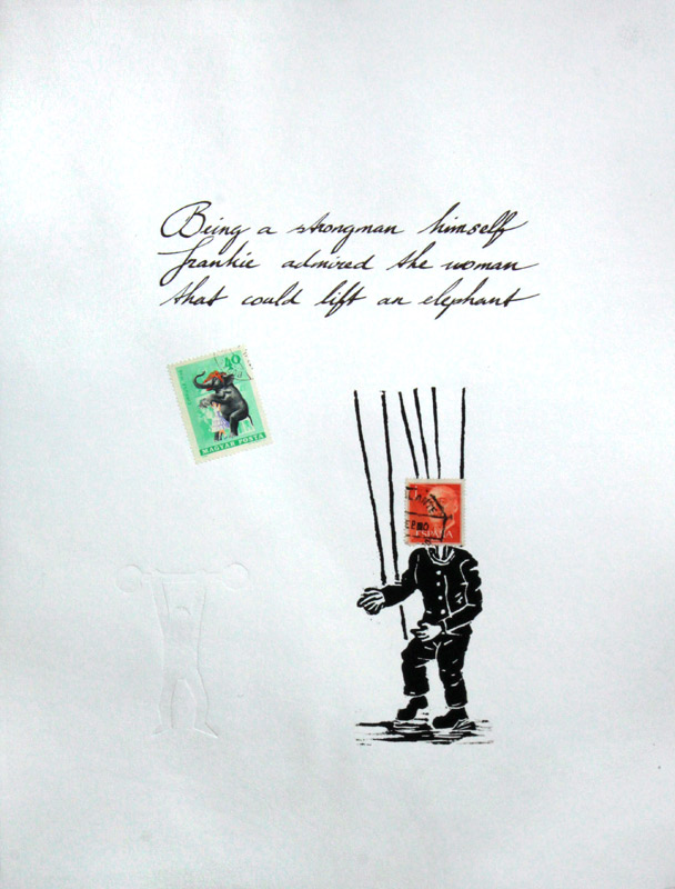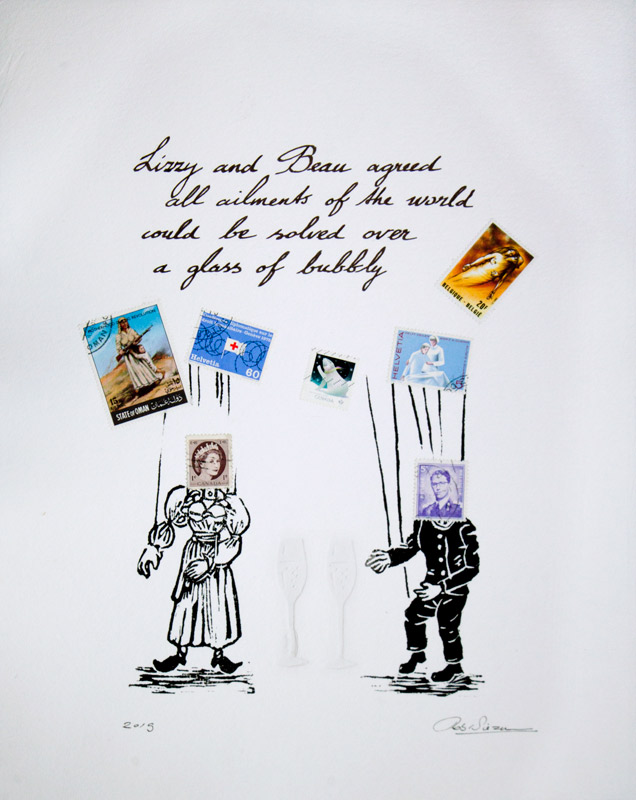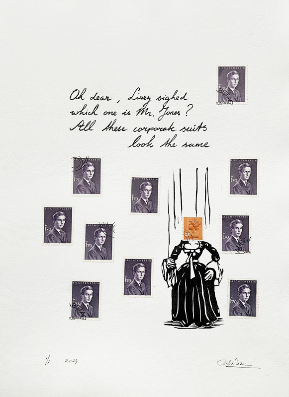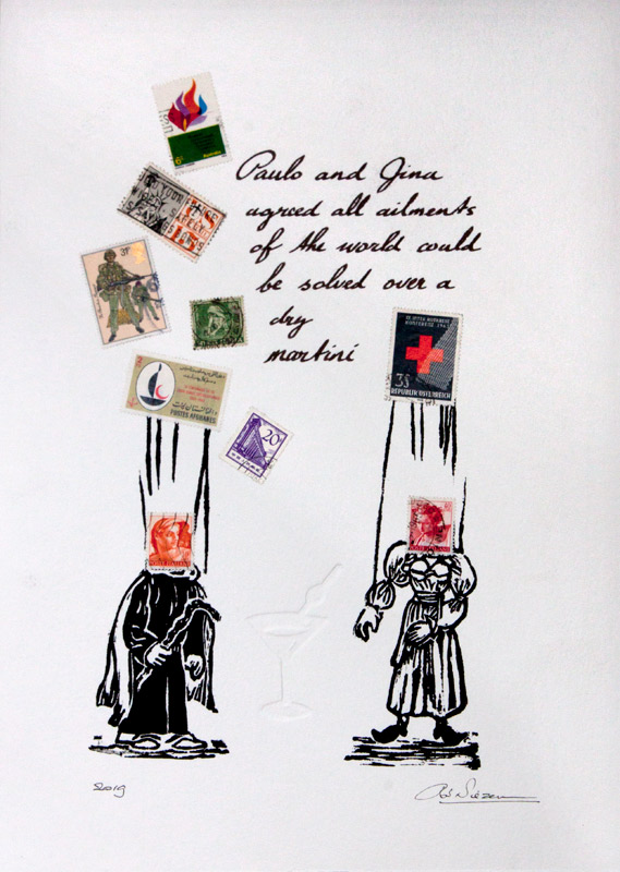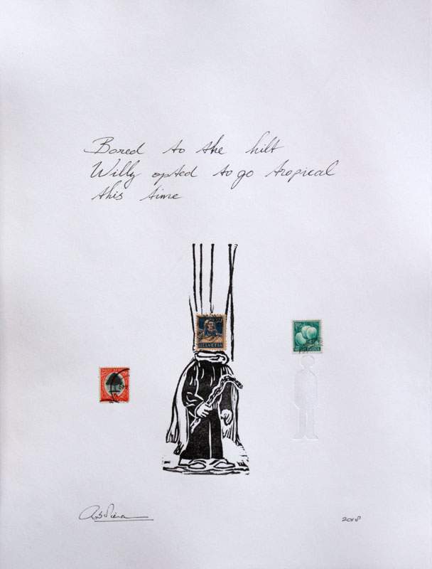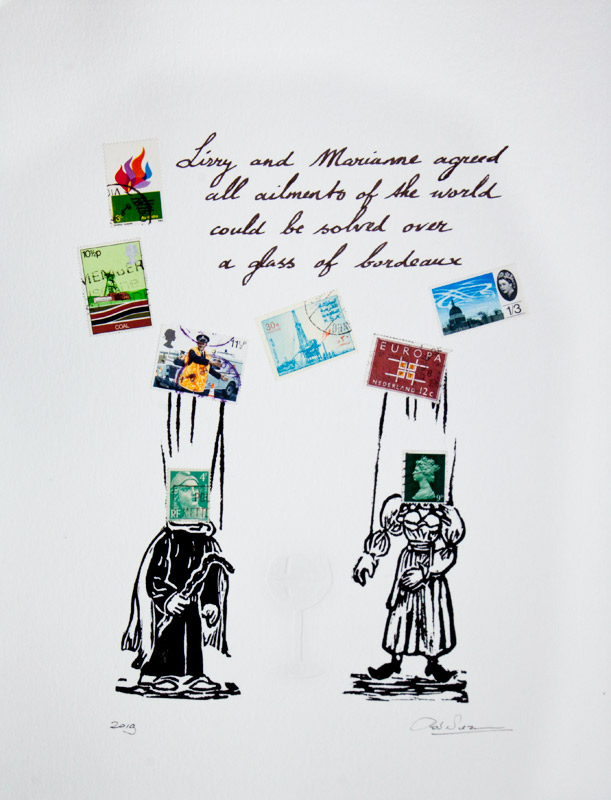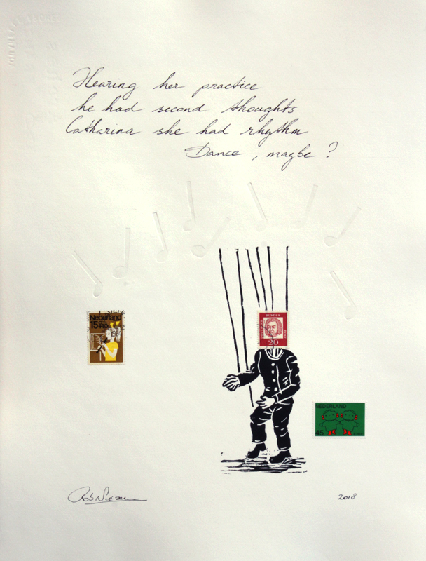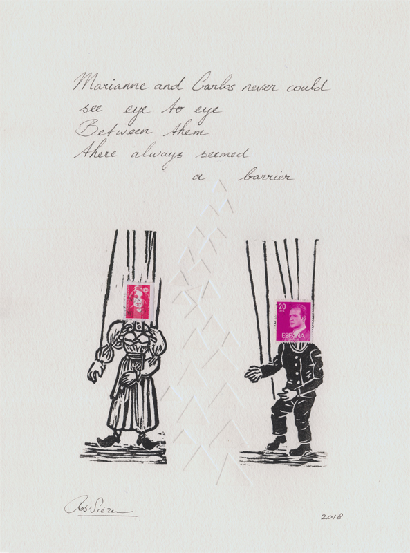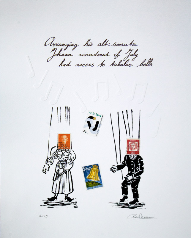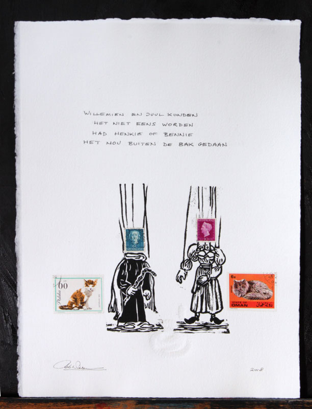 Heads & Tales is a series of linocuts with blind emboss, postage stamps and hand writing on paper. National postage stamps have for a long time featured portraits of heads of state, royalty and heroes as confirmation of a country’s identity, traits and values. The Heads & Tales series reflects on typical, or national characteristics of the ‘Heads’ and what they may represent. Put in an imaginary context, they tell their ‘Tales’ as humans, with their prejudices and flaws: honest, illogical, emotional, chaotic, truthful, pompous and petty. Just like us. Feeling bound and constrained by strings that pull in undesired directions.