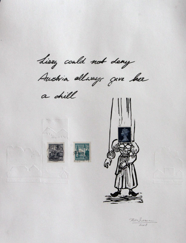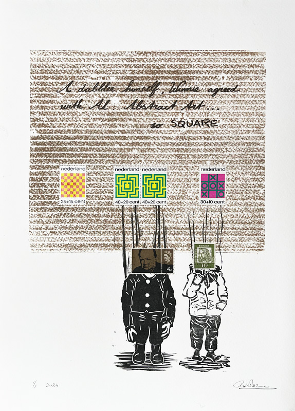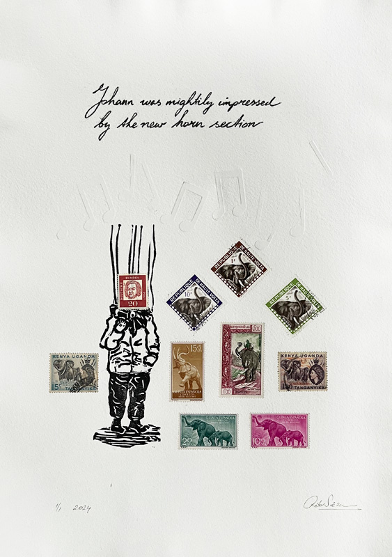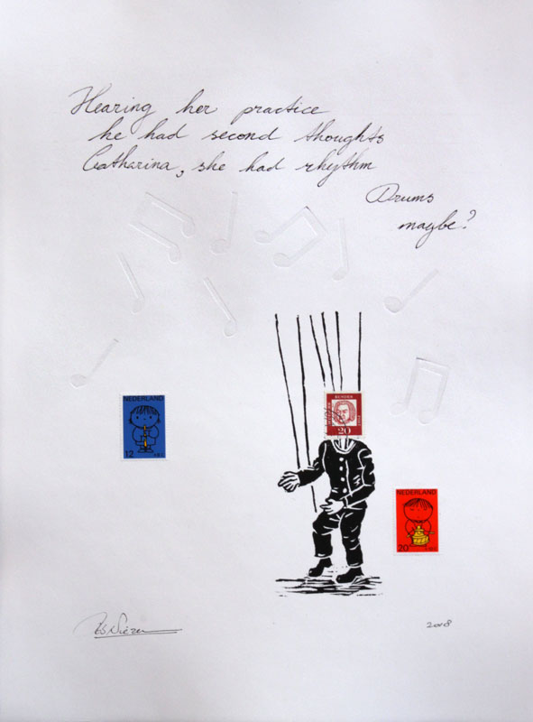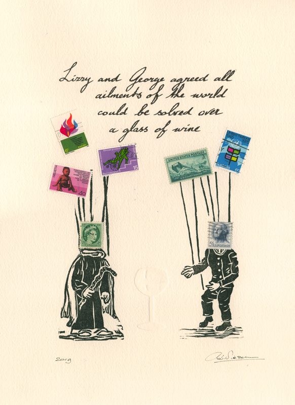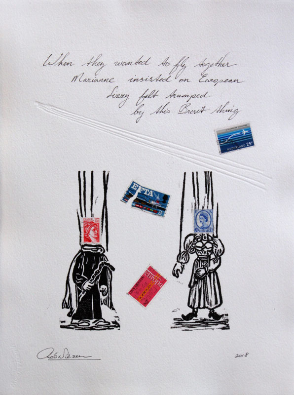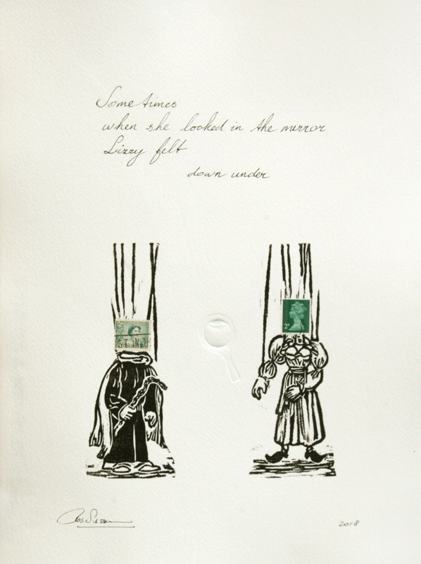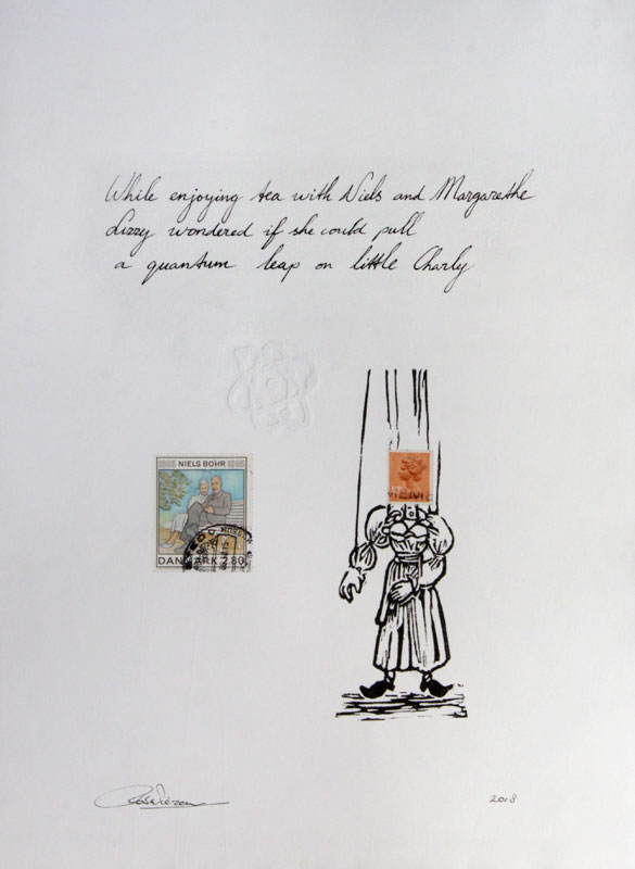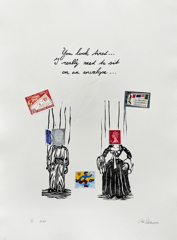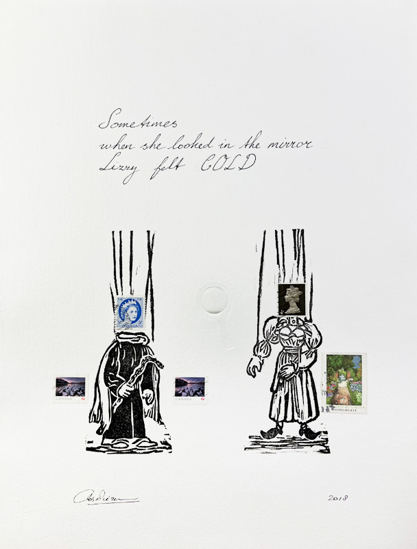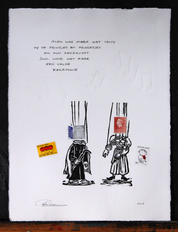 Heads & Tales is a series of linocuts with blind emboss, postage stamps and hand writing on paper. National postage stamps have for a long time featured portraits of heads of state, royalty and heroes as confirmation of a country’s identity, traits and values. The Heads & Tales series reflects on typical, or national characteristics of the ‘Heads’ and what they may represent. Put in an imaginary context, they tell their ‘Tales’ as humans, with their prejudices and flaws: honest, illogical, emotional, chaotic, truthful, pompous and petty. Just like us. Feeling bound and constrained by strings that pull in undesired directions.