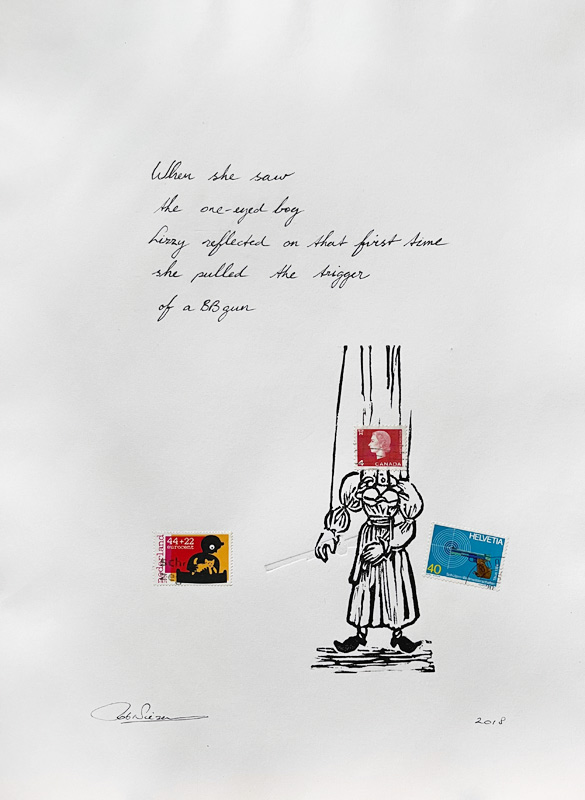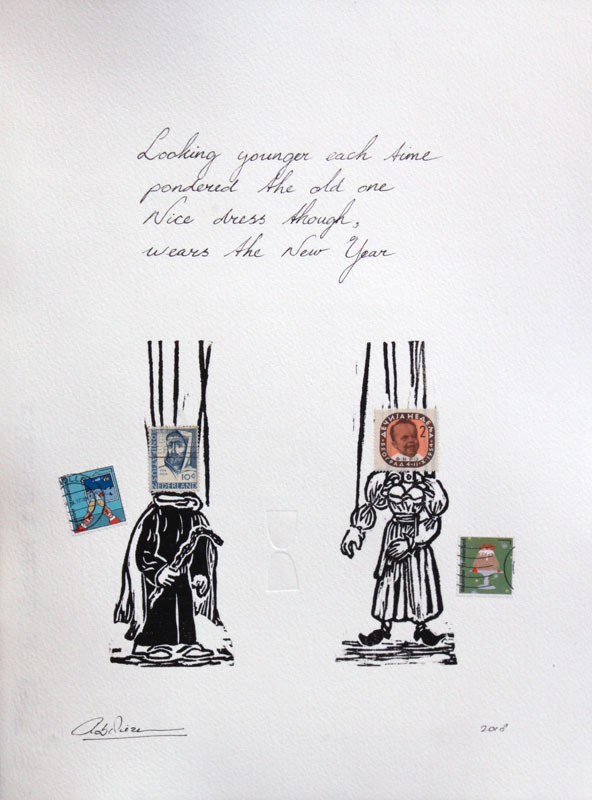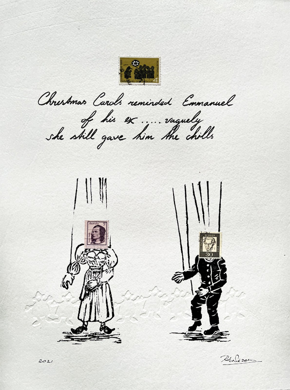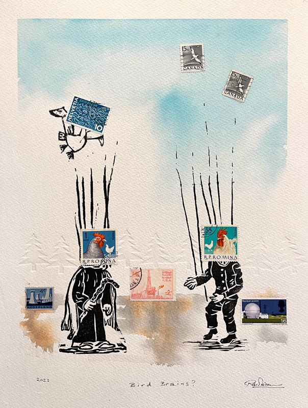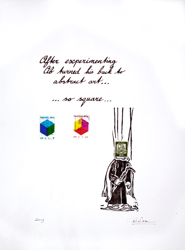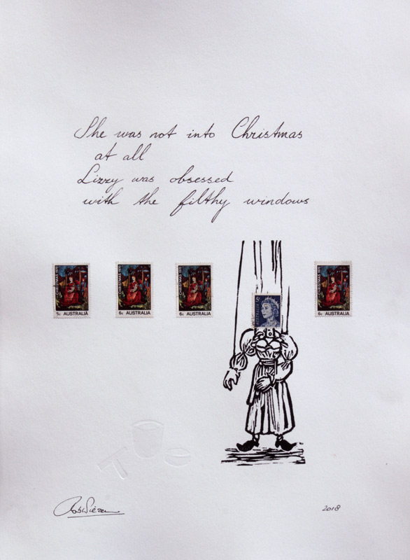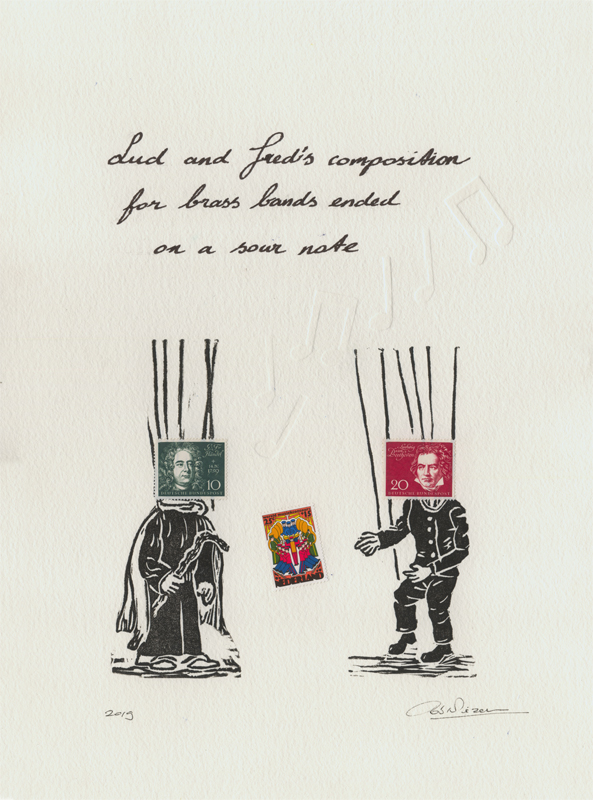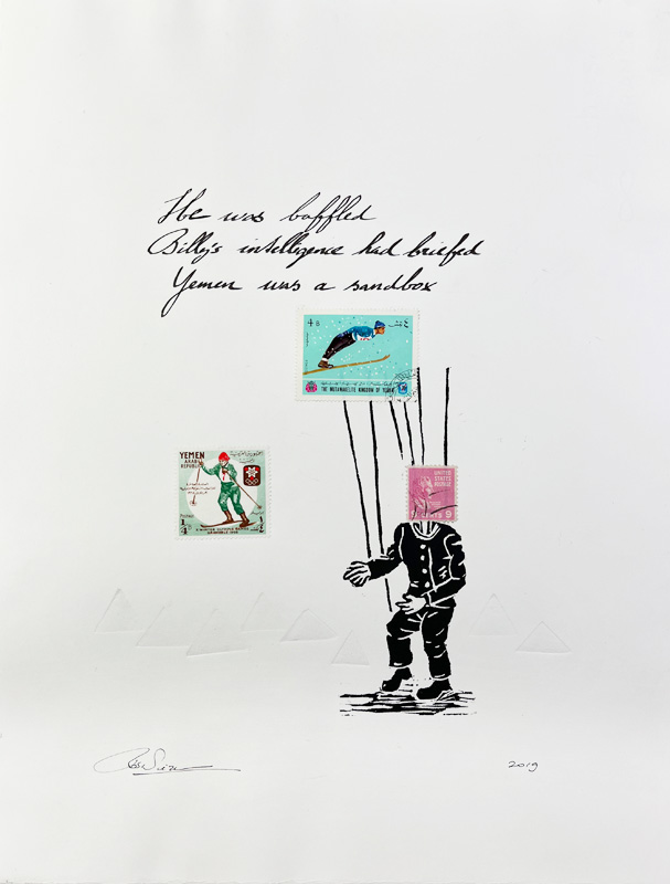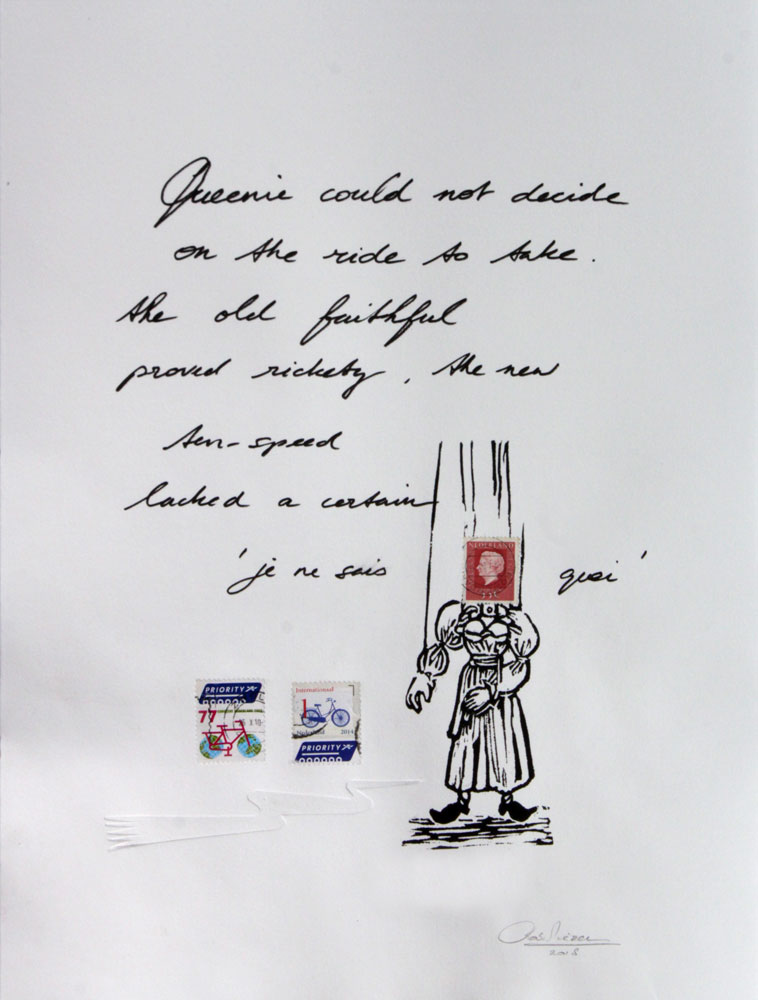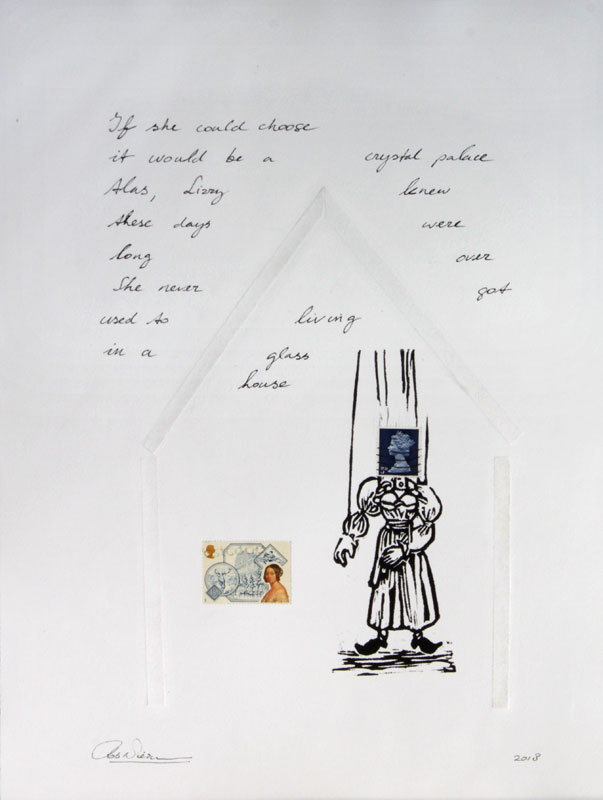 Heads & Tales is a series of linocuts with blind emboss, postage stamps and hand writing on paper. National postage stamps have for a long time featured portraits of heads of state, royalty and heroes as confirmation of a country’s identity, traits and values. The Heads & Tales series reflects on typical, or national characteristics of the ‘Heads’ and what they may represent. Put in an imaginary context, they tell their ‘Tales’ as humans, with their prejudices and flaws: honest, illogical, emotional, chaotic, truthful, pompous and petty. Just like us. Feeling bound and constrained by strings that pull in undesired directions.