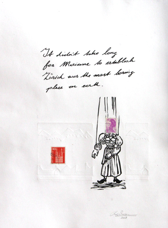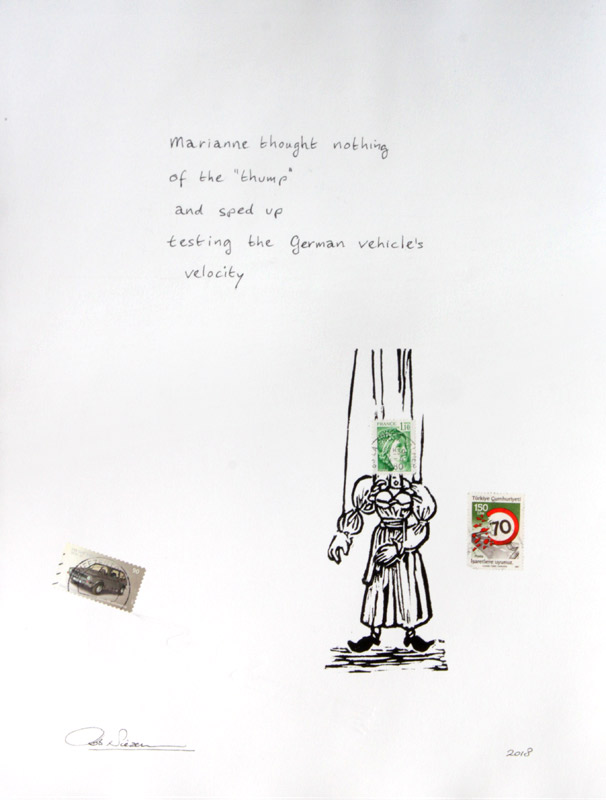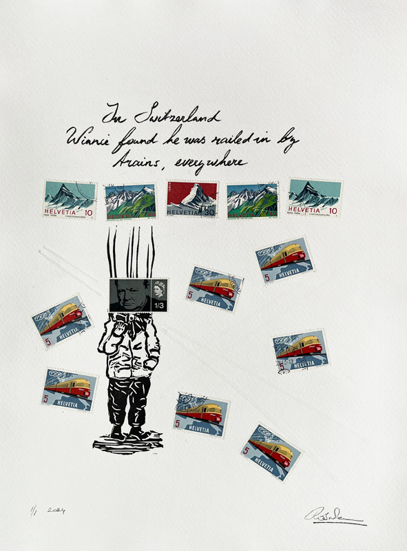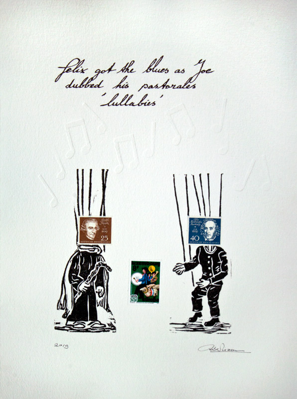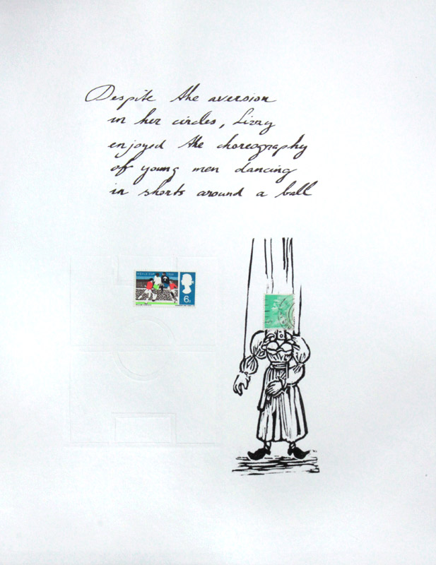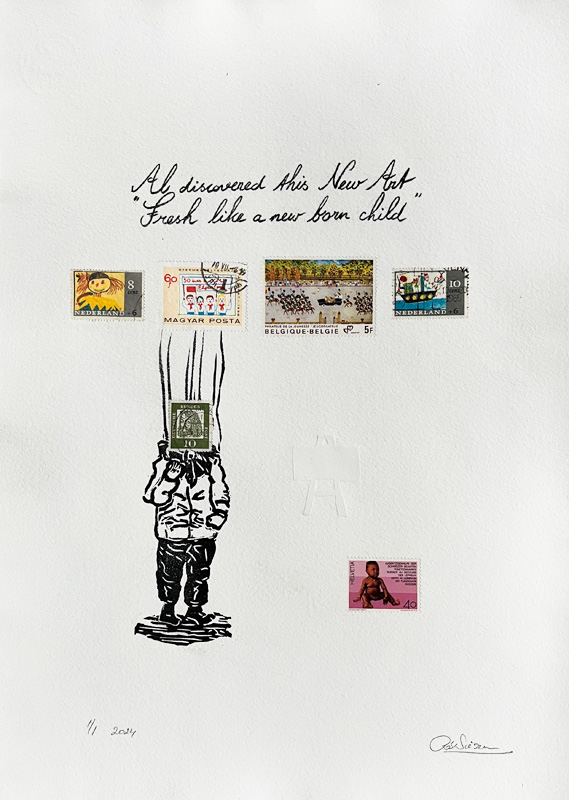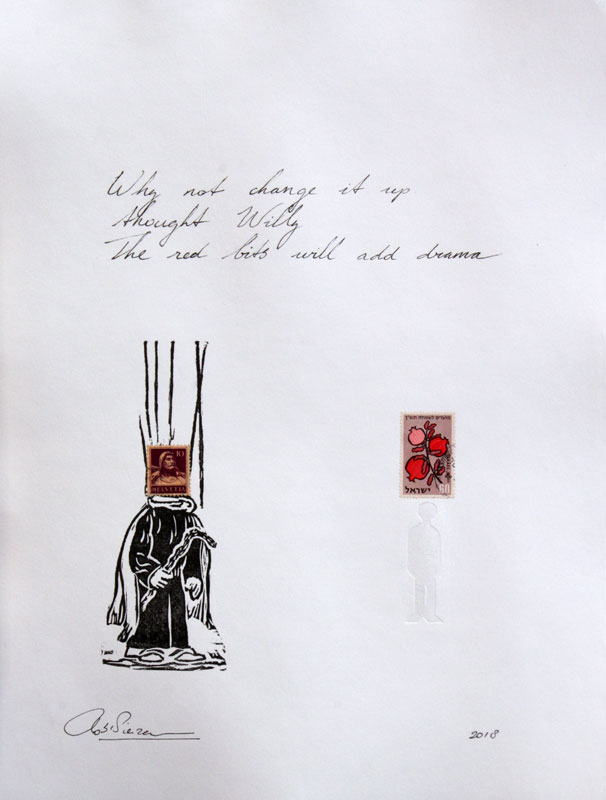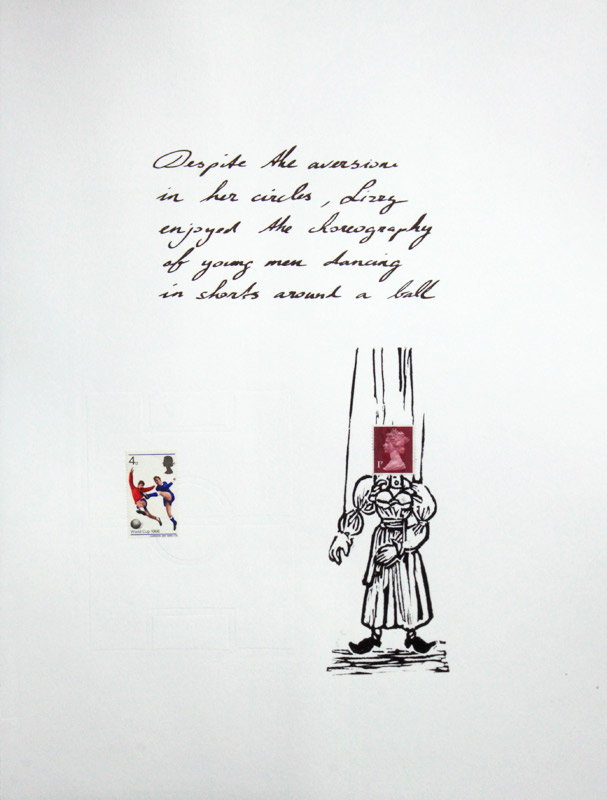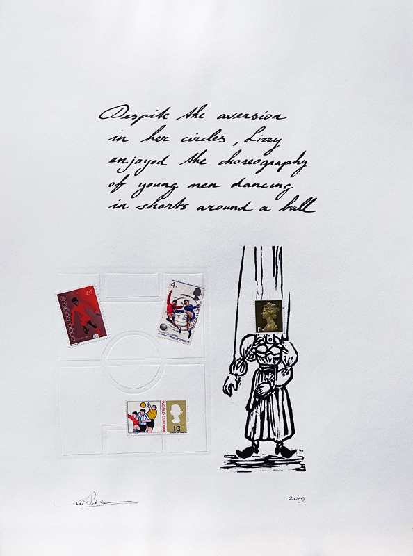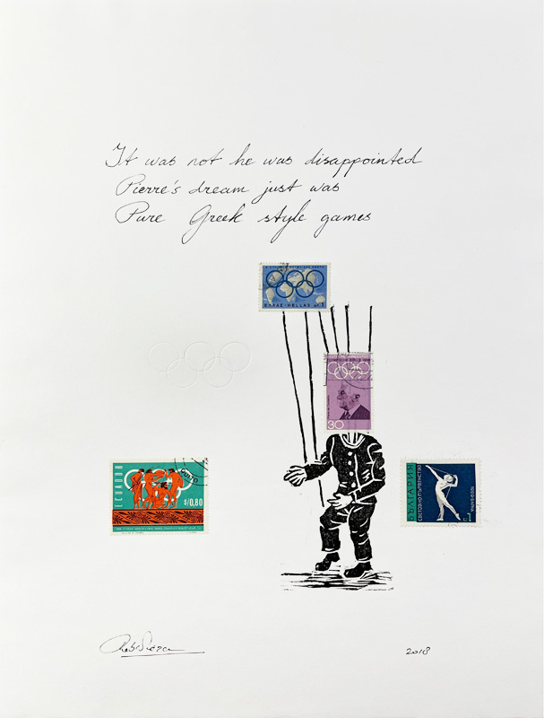 Heads & Tales is a series of linocuts with blind emboss, postage stamps and hand writing on paper. National postage stamps have for a long time featured portraits of heads of state, royalty and heroes as confirmation of a country’s identity, traits and values. The Heads & Tales series reflects on typical, or national characteristics of the ‘Heads’ and what they may represent. Put in an imaginary context, they tell their ‘Tales’ as humans, with their prejudices and flaws: honest, illogical, emotional, chaotic, truthful, pompous and petty. Just like us. Feeling bound and constrained by strings that pull in undesired directions.
