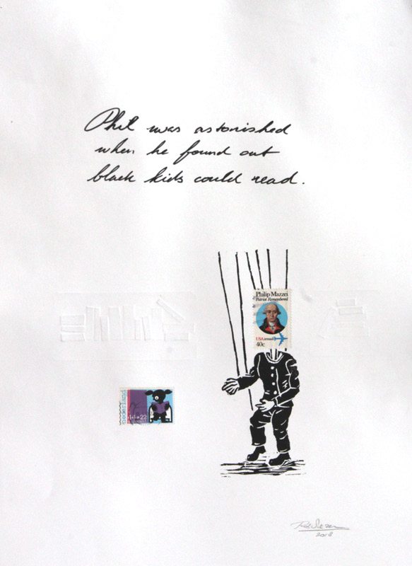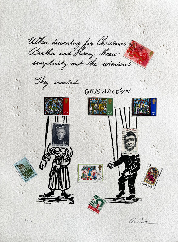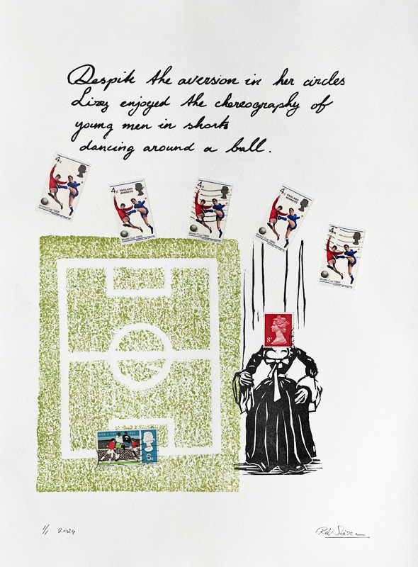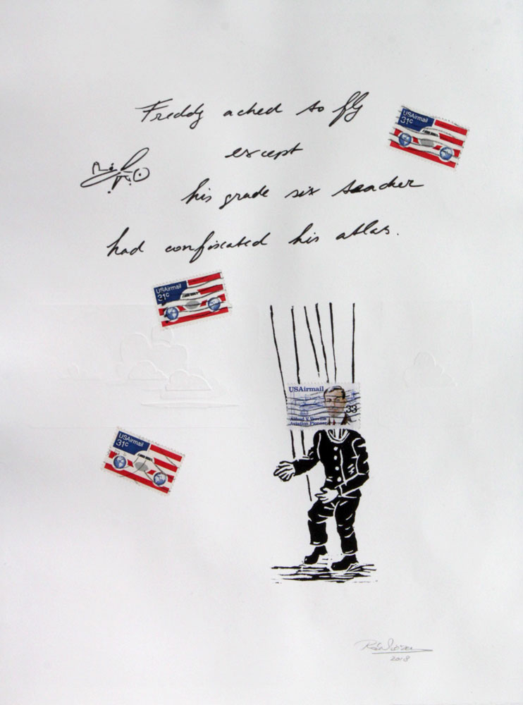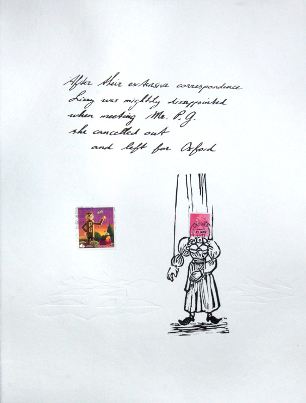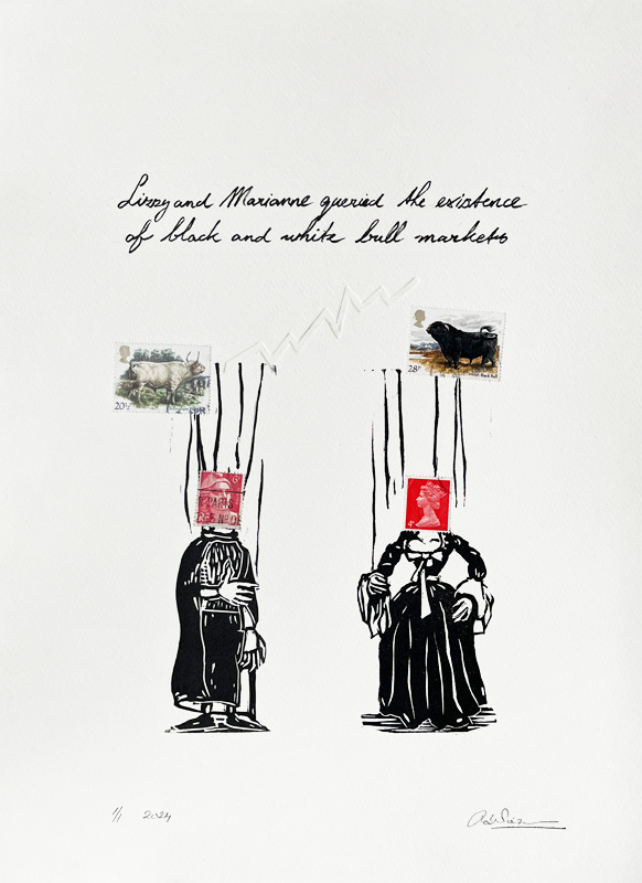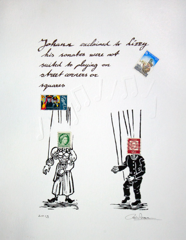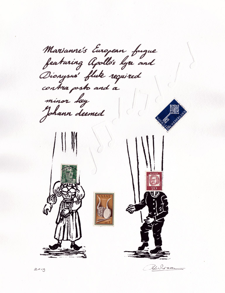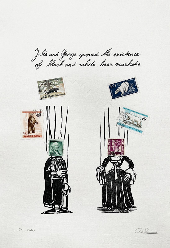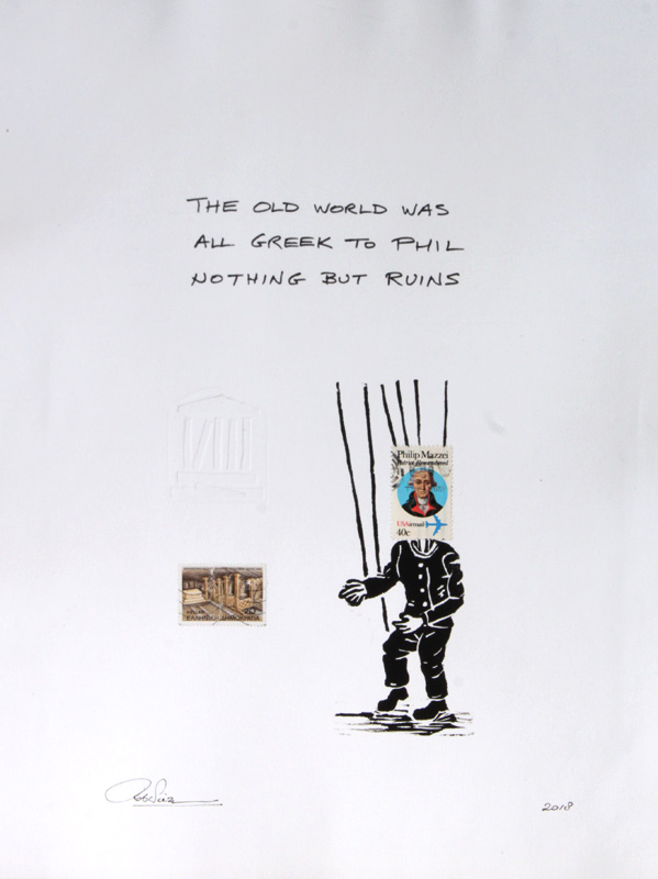 Heads & Tales is a series of linocuts with blind emboss, postage stamps and hand writing on paper. National postage stamps have for a long time featured portraits of heads of state, royalty and heroes as confirmation of a country’s identity, traits and values. The Heads & Tales series reflects on typical, or national characteristics of the ‘Heads’ and what they may represent. Put in an imaginary context, they tell their ‘Tales’ as humans, with their prejudices and flaws: honest, illogical, emotional, chaotic, truthful, pompous and petty. Just like us. Feeling bound and constrained by strings that pull in undesired directions.