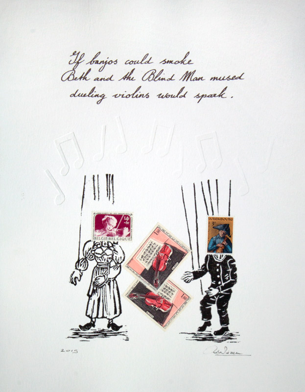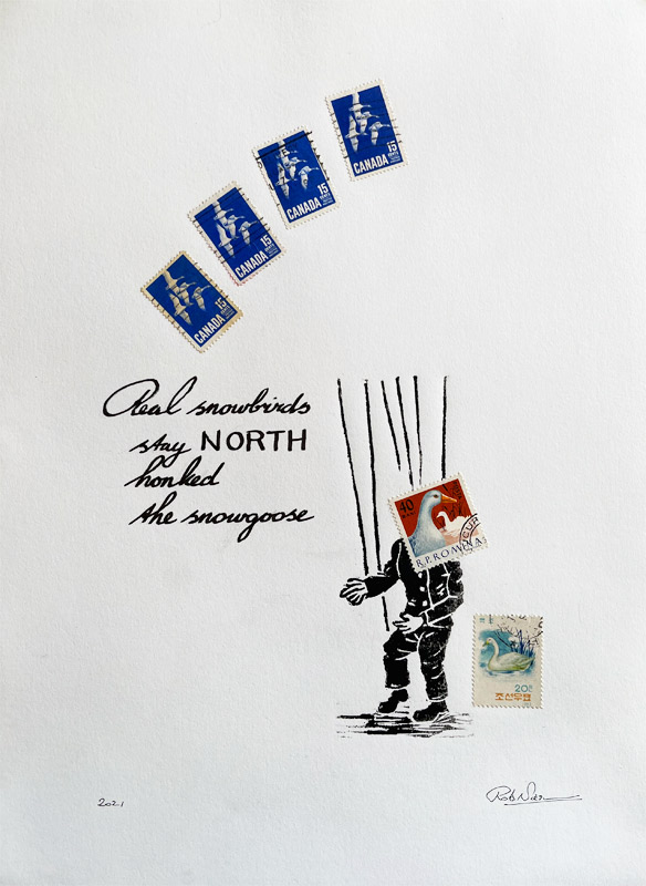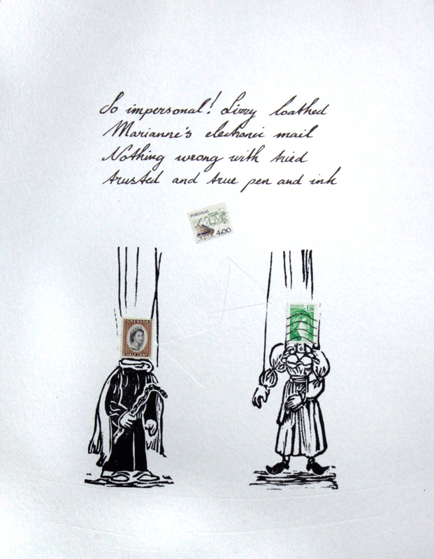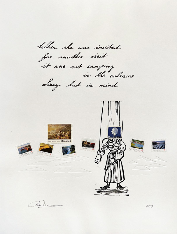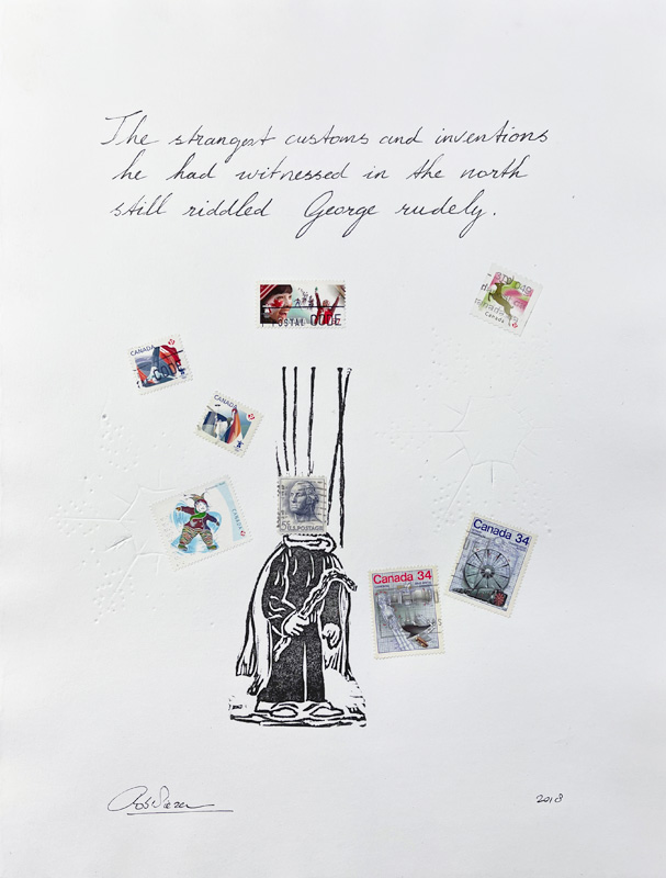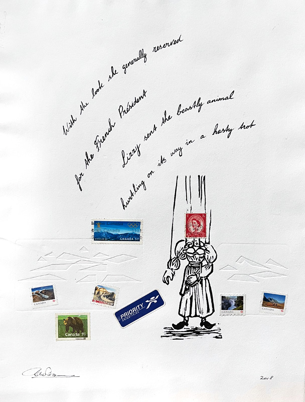The Heads & Tales are hand printed on my etching press. Then, the text is hand written, and finaly the stamps are added. Each piece is unique. All pieces are 14 x 10.5″ or 35 x 26 cm, and packaged in an acid free sleeve with a cardboard backing. CAN $120 + shipping. To order please send me an email at